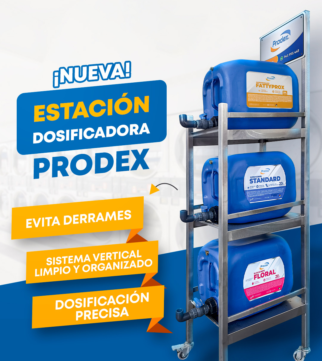 Con la Estación Dosificadora Prodex, optimiza tu lavandería con un sistema limpio, organizado y de dosificación precisa.