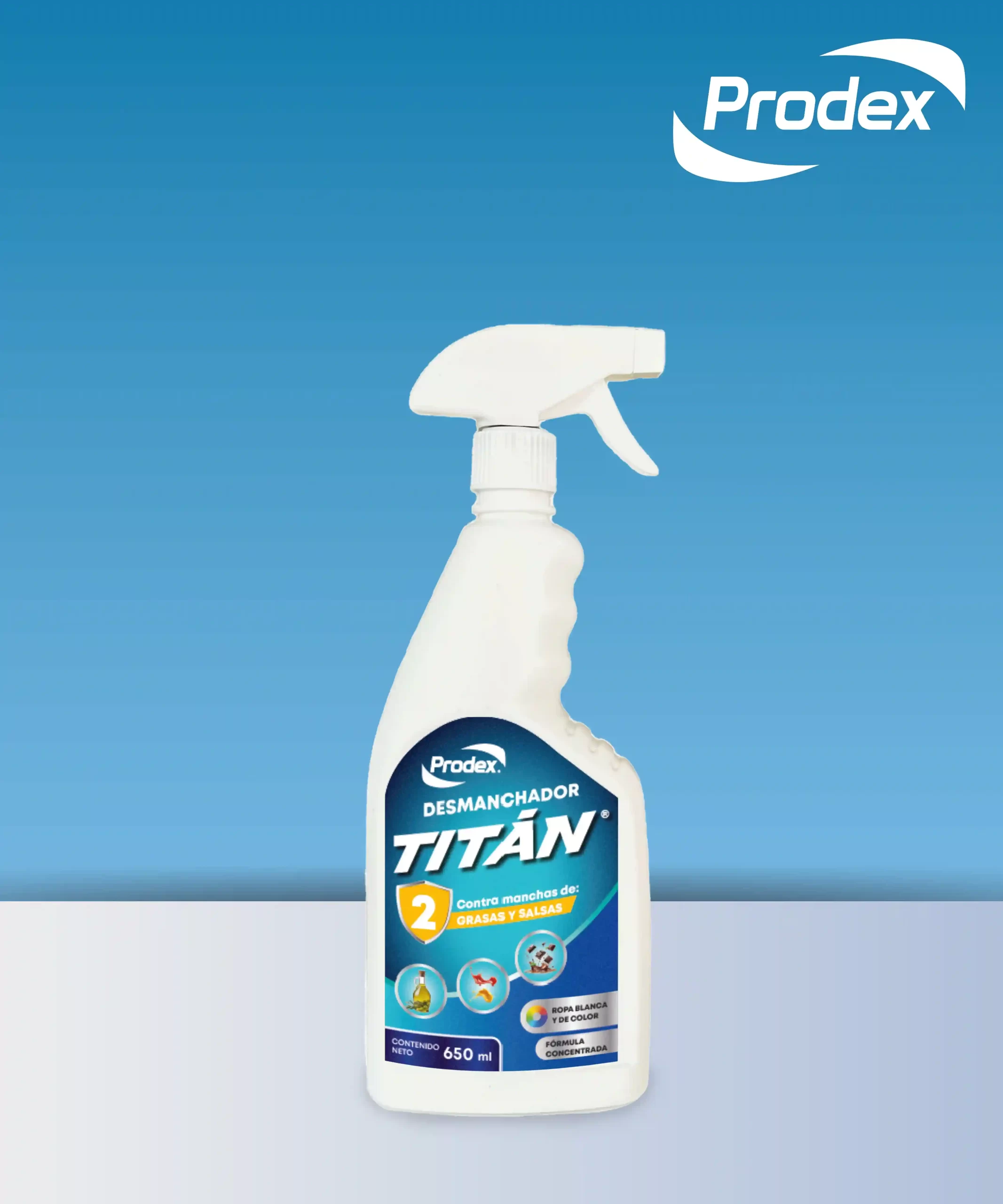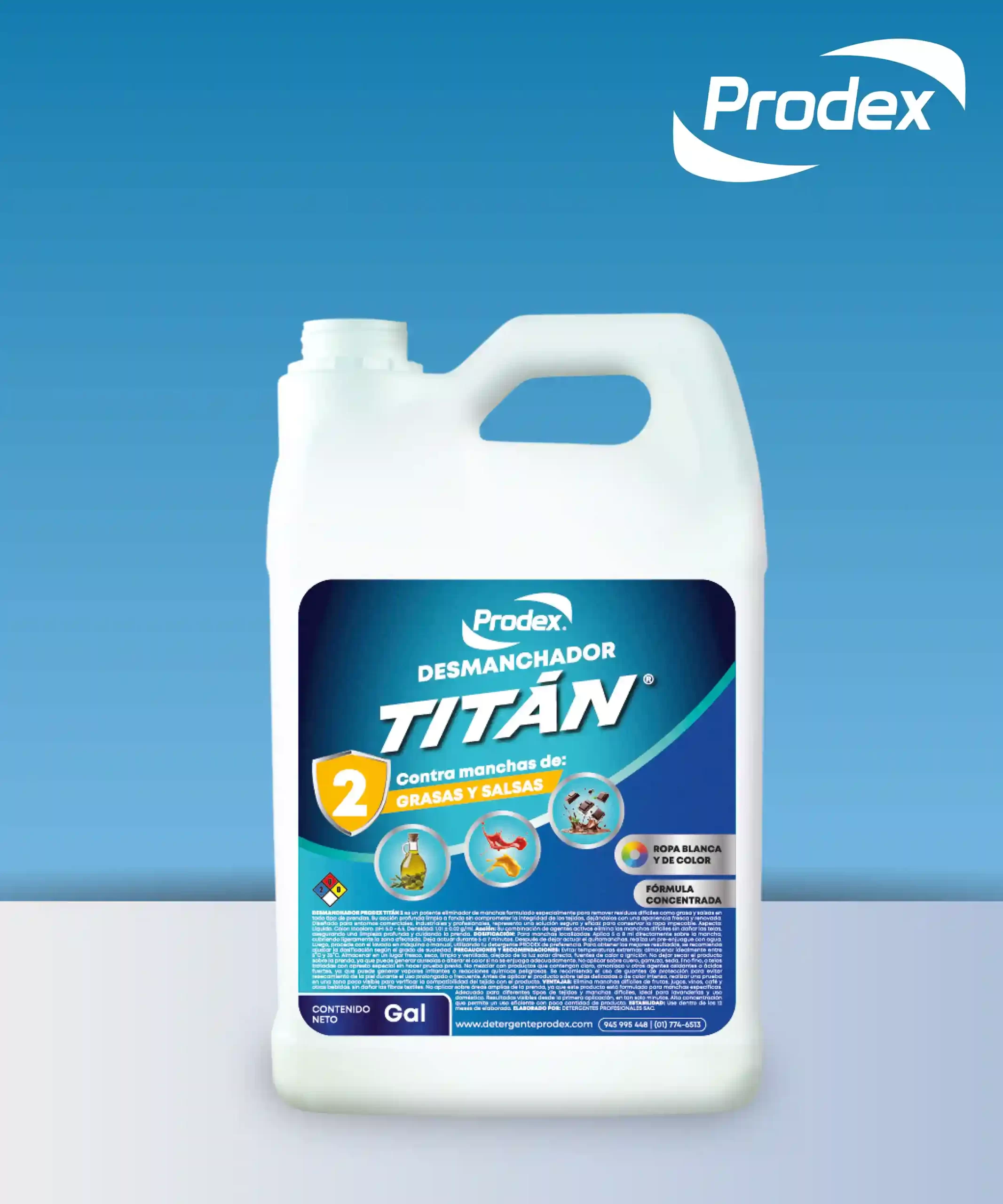 PRODEX TITAN 2 es un quitamanchas industrial de alta eficacia, formulado especialmente para eliminar residuos grasos y manchas de salsas en prendas textiles. Su fórmula concentrada penetra en profundidad, removiendo aceites, aderezos, ketchup y otros residuos sin deteriorar las fibras ni los colores. Es ideal para operaciones donde se requiere máxima eficiencia, optimización de recursos y cuidado de las prendas. Su uso se integra fácilmente en los procesos de prelavado en lavanderías profesionales, institucionales o comerciales.