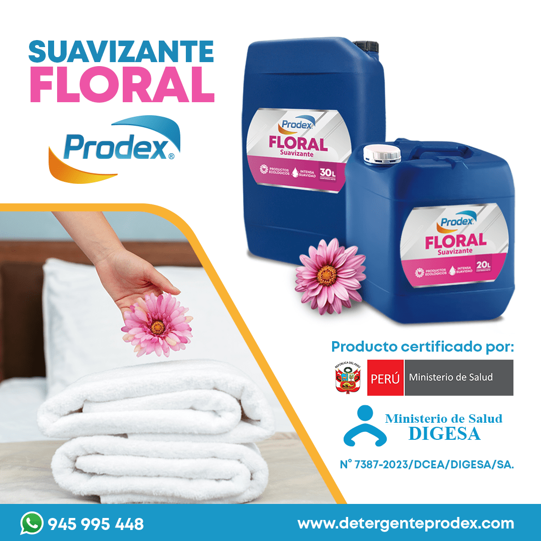N° 7387-2023/DCEA/DIGESA/SASuavizante para ropa Es un producto que disminuye las arrugas y facilita el planchado, cuidando los tejidos de la tela. Solubilidad en agua: Completa Se puede utilizar en fibras sintéticas y naturales. Tiene la ventaja de utilizarse como lubricante y suavizante de fibras. Se obtiene un tacto sedoso y perfumado gracias a su aroma encapsulado a Flores. Producto biodegradable