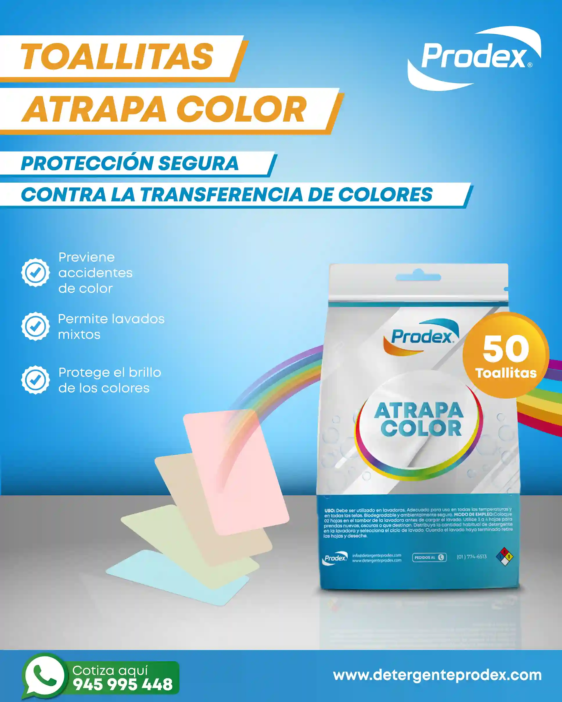 Toallitas Atrapa Color protege tu ropa durante el lavado al evitar la transferencia de colores entre prendas. Con toallitas biodegradables y seguras para el medio ambiente, es ideal para mantener los colores vibrantes y ahorrar tiempo lavando ropa de colores mixtos.